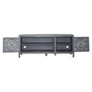 Liberty Furniture Marisol 65 Inch 3 Door Accent TV Stand in Weathered Honey and Soft Wash Gray 2077-AC6526. Marisol 65 accent TV console gives you that Boho chic feel that is so popular today. Boho is a mix of colors, styles, and materials to create a carefree causal comfortable space. Crafted of solid mango with a soft wash grey finish. Features three artisan hand craved doors in a floral pattern, one fixed shelf behind each door, shaped block legs with antique brass knob hardware. Perfect as a TV console.