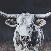 Add homespun charm to modern farmhouse and casual spaces. A longhorn cow takes center stage in this wall art, its white coat contrasting beautifully against the dark background tones. A sleek black frame completes the look.