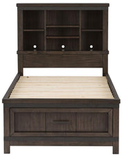 Liberty Furniture Thornwood Hills Full Bookcase Bed in Rock Beaten Gray 759-YBR-FBB. Give your child a bed that will provide plenty of function and storage without sacrificing style with this rustic twin sized bookcase bed. The footboard drawer provides some much needed extra space for any of your child's extra clothes or blankets. The headboard bookcase adds even more space to store books or other toys, ensuring that your child can take advantage of every bit of space in their bedroom.