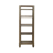 Liberty Furniture Americana Farmhouse Leaning Pier Bookcase in Dusty Taupe 615-HO201. Be distinctively different with the Americana Farmhouse leaning pier bookcase. Crafted with excellence using poplar solids and white oak veneers, this piece features a Wire-Brushed Dusty Taupe finish. There are five graduated shelves implementing the leaning design anchored by turned bun feet. Show off your craftsman's flair with the Americana Farmhouse leaning pier bookcase.