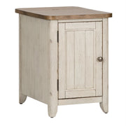 Liberty Farmhouse Reimagined Door Chair Side Table w/ Charging in Antique White 652-OT1022. Style uncompromised with comfort abound. Farmhouse Reimagined offers cottage styles you love in a heavily distressed finish that will work from the beach to the mountains to an industrial loft.