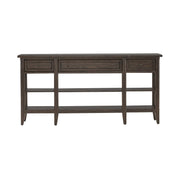 Liberty Furniture Paradise Valley Hall Console Table in Saddle Brown 297-AT7436. Turn an otherwise empty space into something extraordinary with the Paradise Valley hall console table. Crafted with Rubberwood solids and Split Heart White Oak veneers, this piece features a Saddle Brown finish. This hall console table offers breakfront styling for added design appeal. There are three full extension drawers with wood framed drawer fronts that are accented with Antique Pewter knob hardware. The square tapered legs have chamfered edges to soften the case and draw attention to the two open bottom shelves that are perfect for storage or display items. The Paradise Valley hall console table works great in the entryway or behind the sofa and captures grand opulence with comfortable rustic styling.