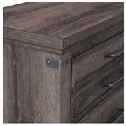 Liberty Furniture Lakeside Haven 6 Drawer Dresser in Brownstone 903-BR31. Hit the pause button on your hectic life with the Lakeside Haven six drawer dresser. Crafted with excellence using a rubberwood solid frame with 3D Paper Laminate, this piece features a Brownstone finish. Hammered metal corner accent plates along with wood framed drawer fronts and Antique Pewter bar pull hardware add for visual appeal. The top two drawers feature bluff-cut drawer fronts giving the illusion of multiple smaller drawers while still offering deep storage. Clean lines and block feet round out the rustic, cottage look. The urban living design and the rustic charm or cottage appeal of the Lakeside Haven six drawer dresser offer style, substance, and handcrafted character.