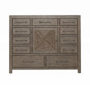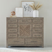 Liberty Furniture Skyview Lodge Chesser in Cobblestone 906-BR32. Experience the perfect fusion of style and substance with the Skyview Lodge 11 drawer 1 door chesser. Crafted with meticulous attention to detail using Rubberwood solids and White Oak veneers, this chesser features a Cobblestone finish. Adorning the exterior are wide picture frame moldings, adding a touch of classic charm to the piece. The block foot base provides stability and a hint of modern flair, harmonizing beautifully with its transitional aesthetic. Storage abounds within this chesser, boasting a total of 11 drawers and 1 door, offering ample space to organize and stow away your belongings. What truly sets this chesser apart is its door, which showcases a reclaimed X-panel, infusing the piece with visual and textural interest. Behind the door lies an adjustable wood shelf, offering customizable storage options to suit your needs. The flat drawer fronts, softly rounded for a touch of sophistication, graduate in size from top to bottom, enhancing both the visual appeal and practicality of the chesser. Crafted for both style and convenience, the top drawers of this chesser offer premium felt lining, providing a luxurious touch for delicate items. Meanwhile, the bottom drawers feature a cedar-lined panel, ensuring your garments remain fresh and protected. Experience seamless functionality with all drawers operating on soft-closing drawer guides, allowing for smooth and quiet operation. Accentuating its elegance are custom Antique Pewter bar pull hardware. Whether sitting by a roaring fire or roaring river, Skyview Lodge creates the perfect casual, relaxing environment.