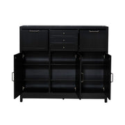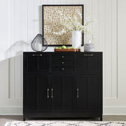 Liberty Furniture Capeside Cottage Buffet in Royal Black 224-CB5648-B. Forget the fancy restaurants and make your home the best place to dine with the Capeside Cottage buffet. Crafted with excellence using rubberwood solids and China maple veneers, this buffet features a Royal Black finish. The buffet has clean straight lines and features two deep full extension drawers flanking three smaller full extension drawers, all with wood framed drawer fronts and lined with felt. Three wood framed doors on European hinges stretch the base of the case and feature two adjustable shelves behind each door for plenty of storage. If you live in the country, reside near the coast, or wish you did, the Coastal Farmhouse feel of the Capeside Cottage buffet can help make your homes desired look complete.