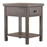 Liberty Furniture Modern Farmhouse Chair Side Table in Brown 406-OT1023. Enhance your space with the Modern Farmhouse drawer chair side table. Crafted of poplar solids with knotty white oak veneers, this piece features a dusty charcoal finish with heavy distressing, a full extension drawer with a bottom shelf for additional storage, appealing washed brass knob hardware. Also available in an alternate finish, this modern farmhouse piece would be a wonderful addition to your cottage or contemporary style space.