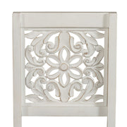 Liberty Furniture Trellis Lane Accent Chair in Weathered White 2094-AC3002. The Boho inspired Trellis Lane accent chair will make your room both functional and stylish. Crafted of solid mango in a weathered white finish with brown thru. Features artisan hand carved chair back, saddle shaped seat and blocked tapered legs. Add the accent writing desk and bookcase to complete your look.