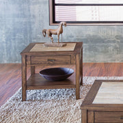 Liberty Furniture Mesa Valley End Table in Tobacco 147-OT1020. Enhance your space with the rustic styling Mesa Valley end table. Crafted of poplar solids, oak veneers and ceramic tile tops, this piece features a tobacco finish, rural ceramic tile top, bottom shelf storage, one full extension fully stained interior drawer accented by custom antiqued brass bar pull hardware, anchored by a tapered leg design. The tobacco finish allows for a universal appeal with essential full extension metal side drawer glides.