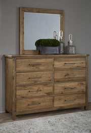 Vaughan Bassett Dovetail Landscape Mirror in Natural 752-446. Vaughan Bassett has developed a patent-pending process that allows them to accelerate how wood ages. We have kept the splits; knots; cracks; and the bold grain pattern found in Oak lumber to create this reclaimed look in this beautiful and unique bedroom.